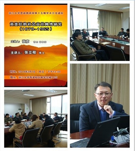 2014年3月7日下午,西溪校区教学主楼1125室座无虚席,浙江大学思政部第十五期学术沙龙如期举行,本次沙龙主题为“黄炎培的社会交往网络研究(1878-1965)”,思政部青年教师张立程博士做了主题报告,张彦副教授担任本次沙龙的主持人,这是2014年新学期第一次学术沙龙,思政部众多师生积极参与了这次活动。