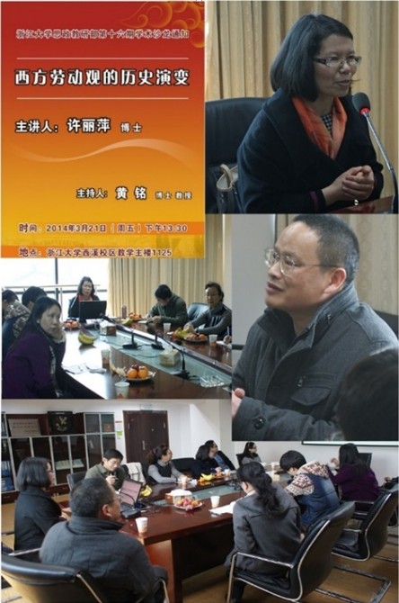 3月21日下午,西溪校区教学主楼1125座无虚席,浙江大学思政部第十六期学术沙龙“西方劳动观的历史演变”的学术报告正在举行,思政部的许丽萍博士做了主题发言,黄铭教授主持了本次活动。