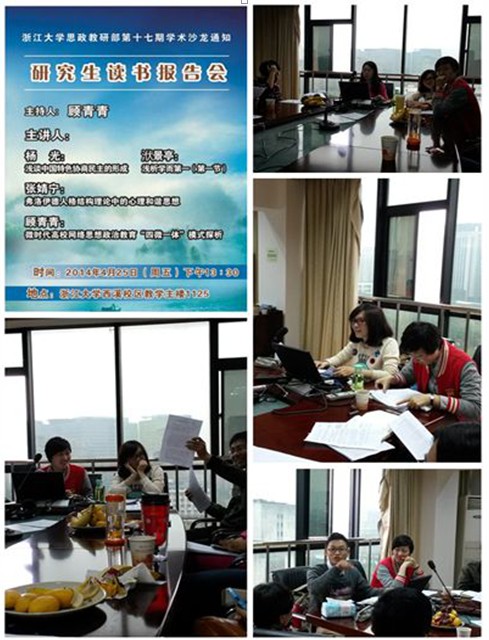 4月25日下午,浙江大学思政部全体研究生聚集西溪校区教学主楼1125,思政部第十七期学术沙龙读书报告交流会正在举行,思政部的顾青青同学主持本次活动,张婧宁、顾青青、杨光和洑景亭四位同学做报告,刘召峰、王心月、朱培霞、吴旭平等教师做点评。