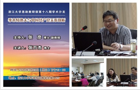 2014年5月23日下午,浙江大学思政部在教学主楼1125举办第十八期学术沙龙,本次沙龙的主题是“季米特洛夫与中国共产党关系探析”,张万杰博士做了主题报告,张彦副教授担任本次沙龙的主持人,思政部众多师生积极参加了这次活动。