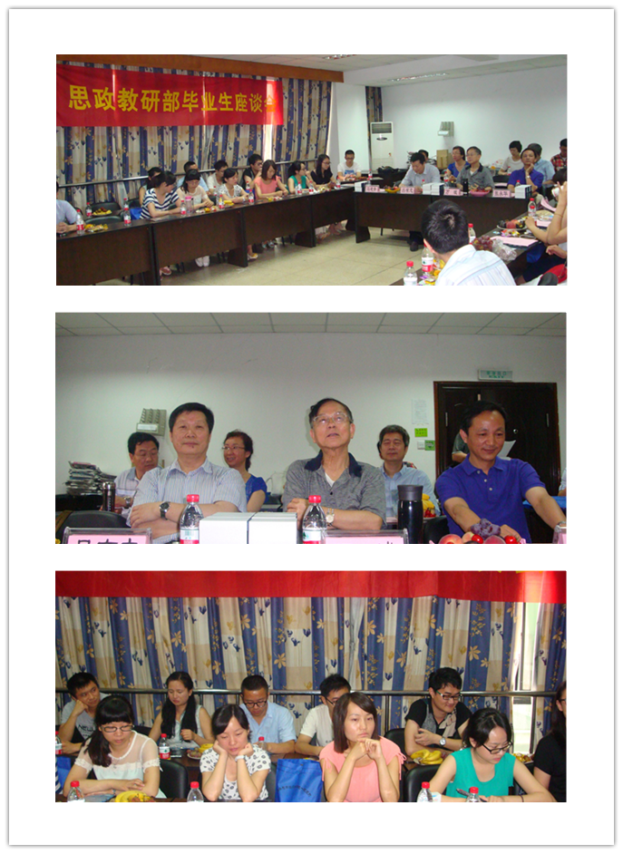 2014年6月19日上午,浙江大学思想政治理论教学科研部2014届毕业生座谈会于教学主楼1025拉开序幕,一段段美好的回忆、一幕幕感人的画面,思政部的毕业生们为自己美丽的研究生生活画上了一个完美句点。思政部主任吕有志、党委书记张永华、副主任马建青、学科带头人万斌及毕业生导师参加了座谈,并为毕业生们带去了诚挚的祝福和寄望。座谈会由思政部党委委员卢旭东老师主持。