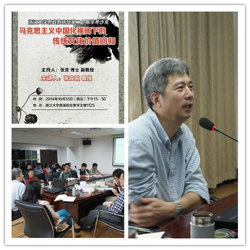 2014年10月31日下午,西溪校区教学主楼1125室座无虚席,浙江大学思政部第二十期学术沙龙如期举行,本次沙龙主题为“马克思主义中国化视阈下的传统文化价值回归”,思政部著名教授张应杭老师做了精彩的主题报告,张彦副教授担任本次沙龙的主持人。这是本学期第一次学术沙龙,思政部众多师生及其它学院慕名而来的师生参与了本次活动。