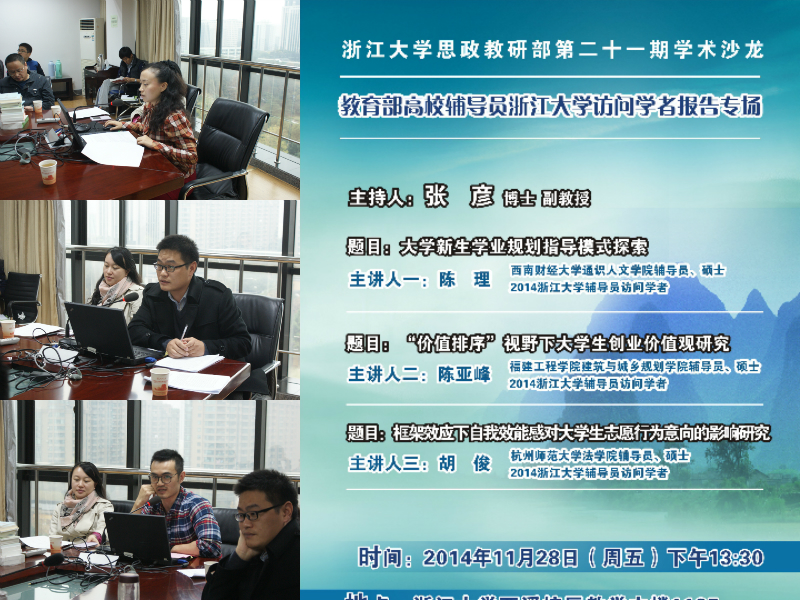 2014年11月28日下午一点半,由张彦副教授主持的浙江大学思政教研部第二十一期学术沙龙在西溪校区教学主楼1125室准时举行。本次沙龙特别邀请教育部高校辅导员浙江大学访问学者陈理老师、陈亚峰老师和胡俊老师做了主题报告。思政部众多师生积极参加了这次活动。