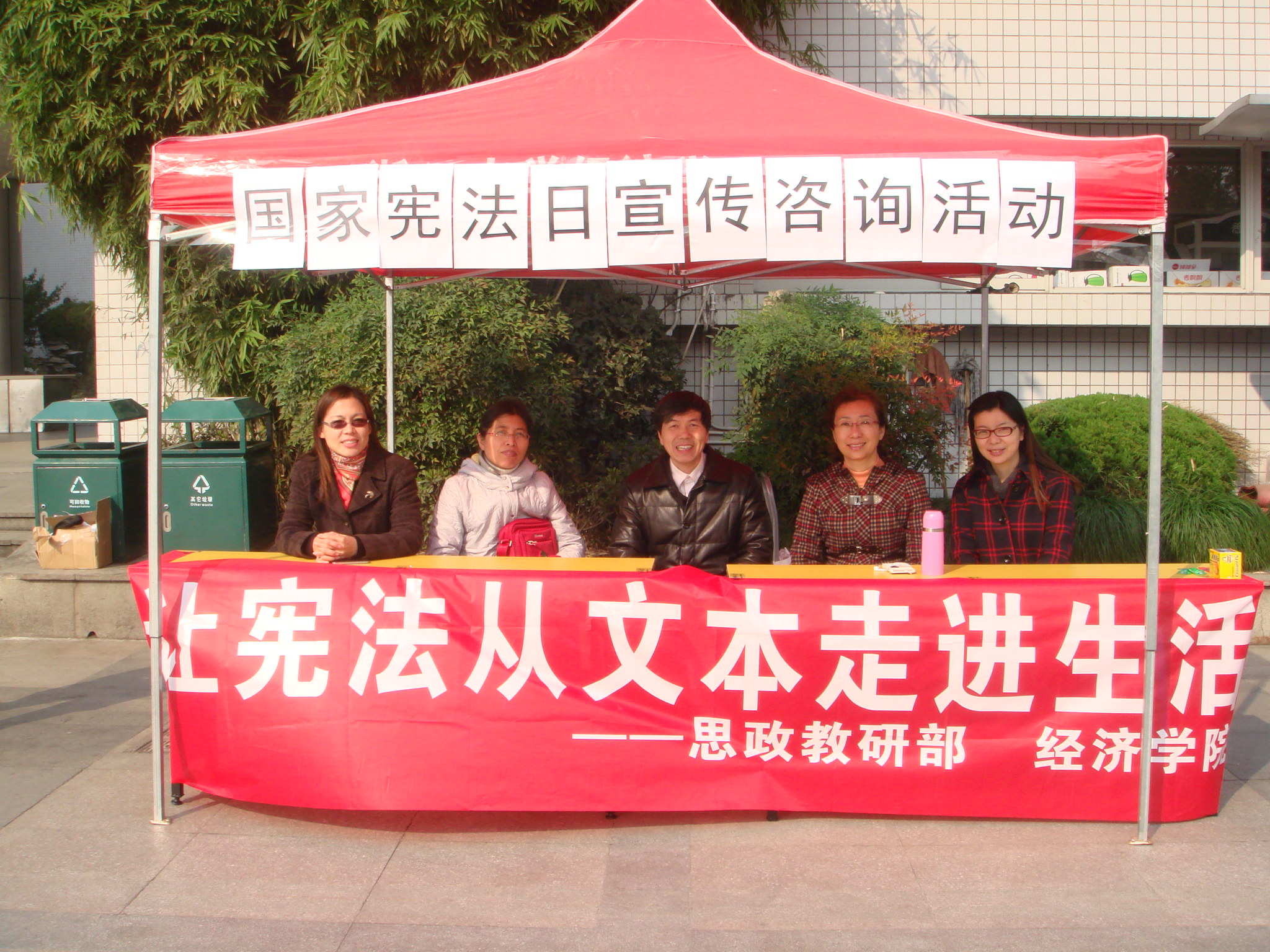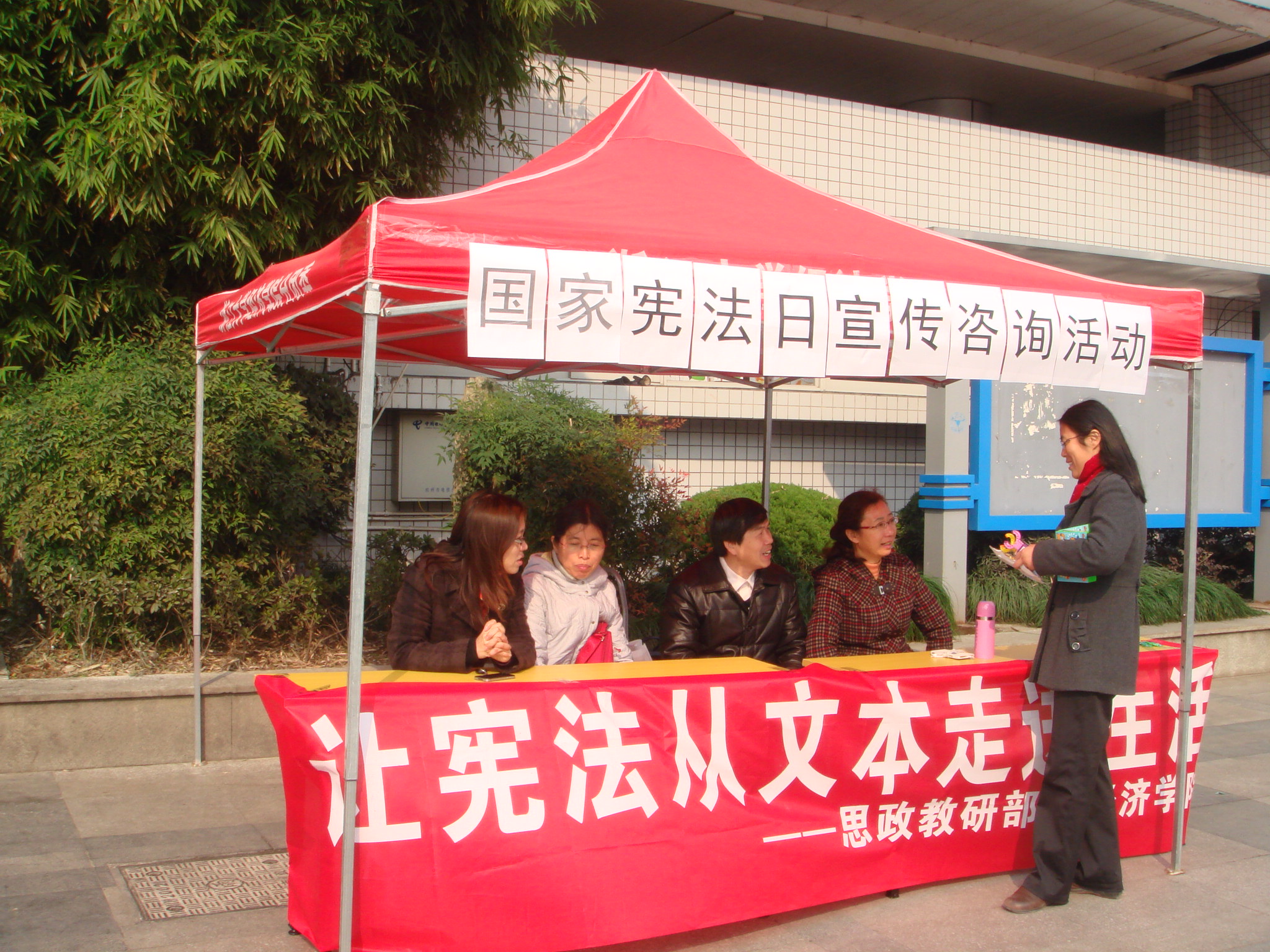 为响应教育部号召,贯彻落实中央十八届四中全会精神,4日中午,也是杭州入冬以来最冷的一天,思政部基础课教研中心、公民教育与法治建设研究所联合经济学院在紫金港紫金文化广场举办“让宪法从文本走入生活”——纪念首个国家宪法日宣传咨询活动。基础课教研中心马建青、王东莉、封丽萍、梁清华老师和兼职教师卢军霞、项淑芳老师以及经济学院的部分师生参加了现场宣传咨询活动。