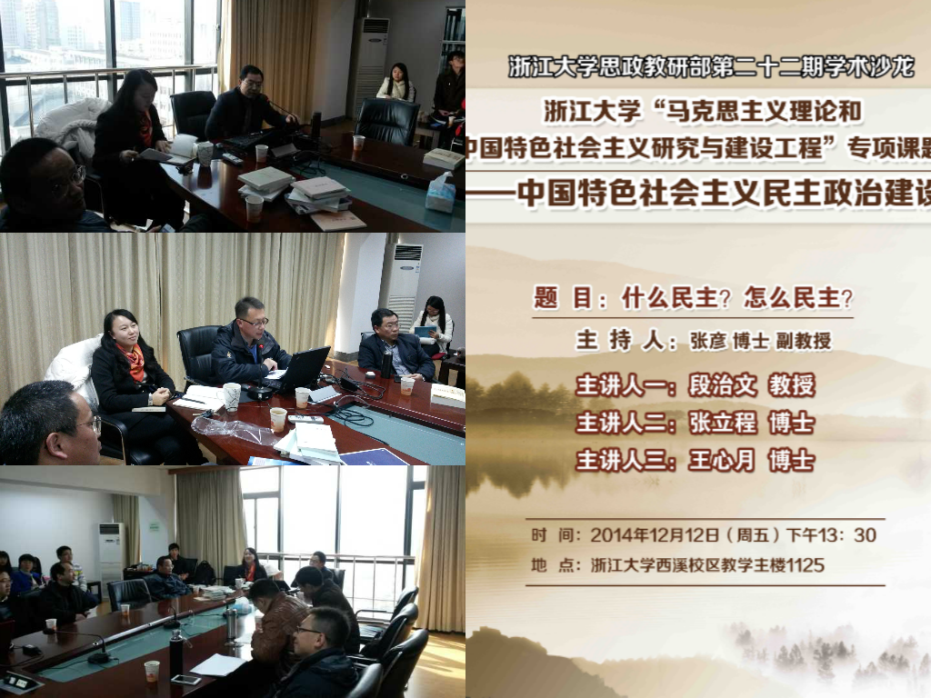 2014年12月12日下午1点半,由张彦副教授主持的浙江大学思政教研部第二十二期学术沙龙在西溪校区教学主楼1125室准时开讲。本次沙龙邀请了段治文教授团队做了“马克思主义理论和中国特色社会主义研究与建设工程”专项课题报告。思政部众多师生积极参加了这次活动。