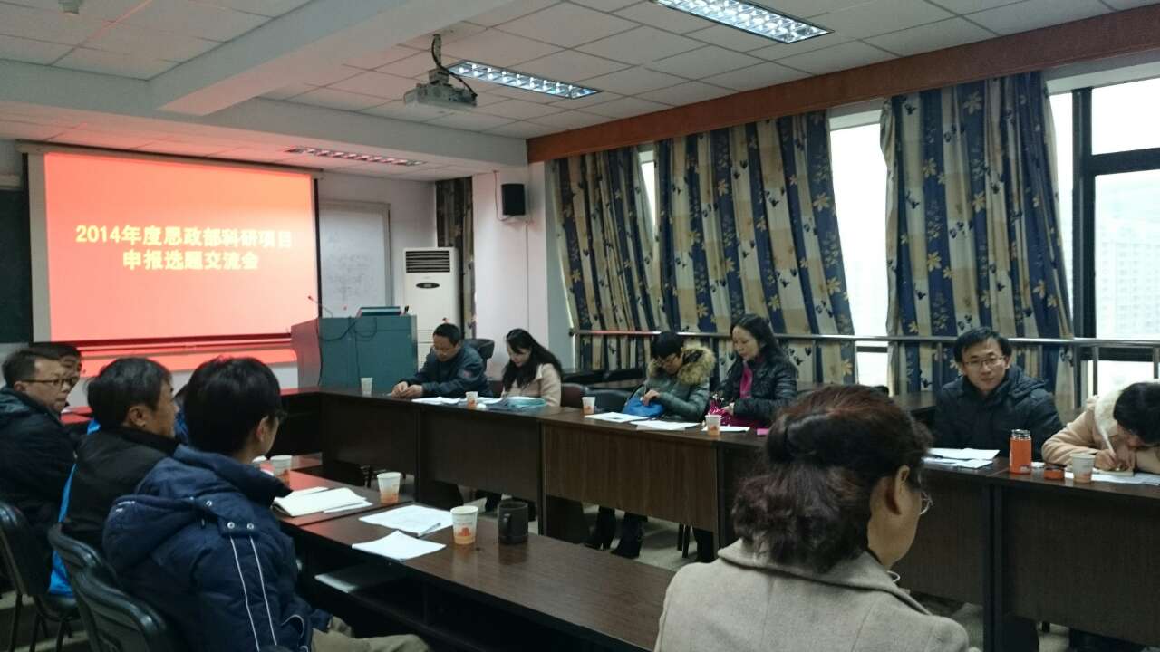 2014年12月19日下午,浙江大学思想政治理论教学科研部在西溪校区教学主楼1025教室召开2014年度思政部科研项目申报选题交流会。为学院新一轮国家社会科学基金项目、教育部人文社会科学研究项目、浙江省社会科学规划项目的组织申报工作打好基础。思政部主任吕有志、副主任马建青及思政部十五位教师参加了会议。