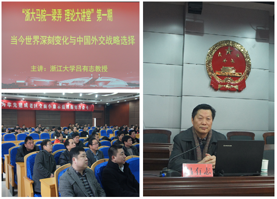 2015年2月5日上午,“浙大马院—梁弄•理论大讲堂”第一期讲座在余姚市梁弄镇政府报告厅举行。浙江大学马克思主义学院(思政教研部主任)吕有志教授为梁弄镇全体机关干部、村(社区)书记、主任、新生代企业家联谊会成员等130余人作了题为“当今世界深刻变化与中国外交战略选择”的专题报告。梁弄镇党委副书记马伟军主持报告会。