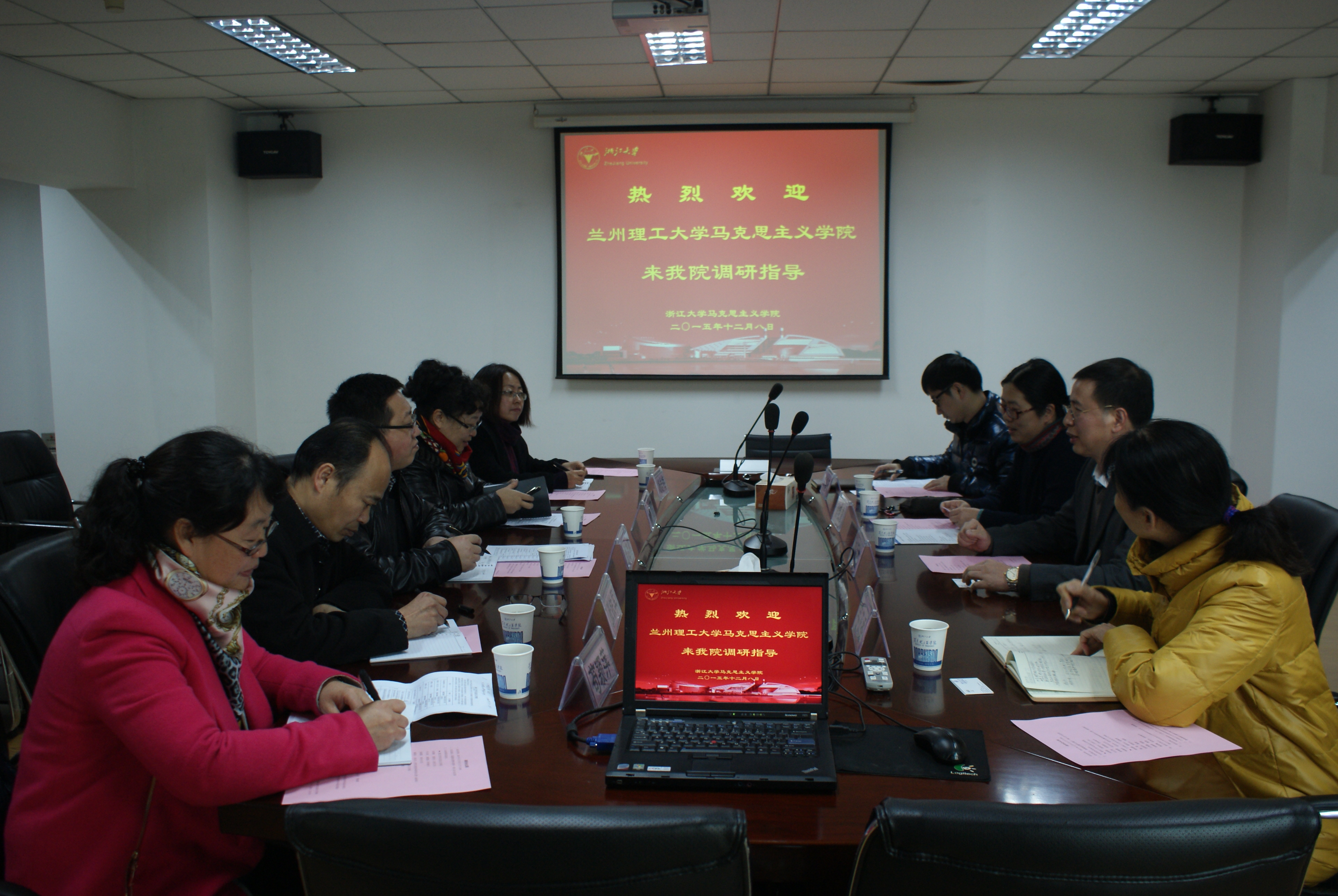 2015年12月8日上午,兰州理工大学马克思主义学院在副院长饶旭鹏、杨莉带领下一行六人到我院进行调研交流。学院副院长(主持工作)刘同舫主持了交流会,马克思主义理论研究所学科秘书宇正香、综合办公室主任徐晓霞、研究生教育管理办公室喻嘉乐等参加了会议。