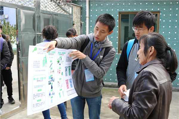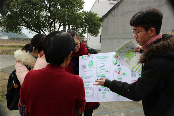 下午两点半的时候第一组在老年活动室外的空地上开始现宣,吸引了很多村民参与道有关垃圾分类的游戏中。其他组的成员开始挨家挨户地进行垃圾分类的介绍。在介绍中我们发现当地的村民对垃圾分已经有了初步的认识,可见试点村的关于垃圾分类的宣传已经开始深入民心。当然在过程中也遇到了一些挫折——和部分老人语言不通。但是同学们尽力用宣传品上的图形让老人们理解我们所要表达的意思,用努力克服了这个困难。