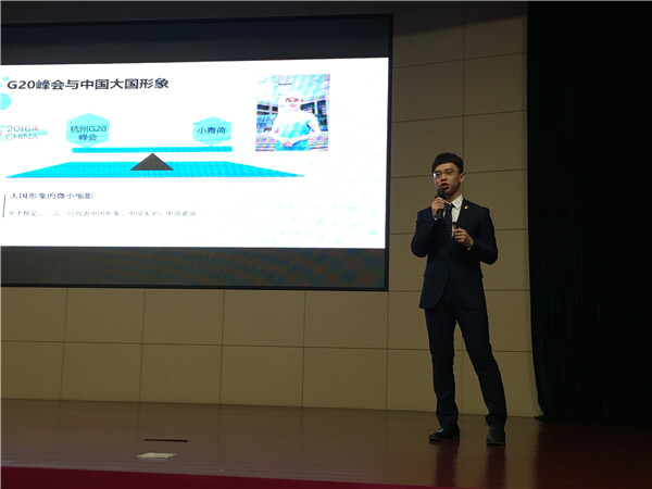 此次参加决赛的10名研究生党支部书记通过赛区预赛选拔产生。在决赛过程中,各选手按抽签顺序依次上台进行5分钟微党课讲授,2分钟党务知识技能测试和3分钟党支部工作情境模拟。我院陈哲远第5个上场,作了主题为“G20峰会与中国大国形象”的微党课。他以G20为背景,结合自身国际政治的专业特色,从成为大国、作为大国和做好大国三方面向大家讲述了中国在世界舞台上的时代使命,并在第二个环节的2分钟知识竞答中获得了满分的好成绩。在最后一环节的情景模拟中,陈哲远更是从容应对,表现出色。