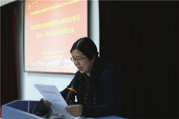为进一步学习贯彻全国高校思想政治工作会议精神,4月14日下午,马克思主义学院在西溪校区教学主楼1109室召开党委中心组理论学习(扩大)会议暨全体教师大会。我院全体教师参会,会议由党委副书记徐晓霞主持。