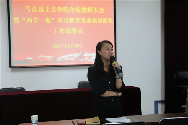 2017年6月29日下午,马克思主义学院召开全院教师大会暨“两学一做”学习教育常态化制度化工作部署会。我院全体教师参会,会议由党委书记吕有志主持。