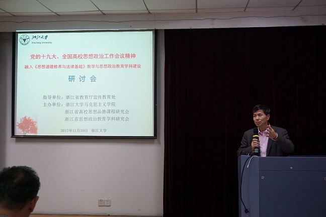为深入学习和贯彻党的十九大、全国高校思想政治工作会议精神,促进“思想道德修养与法律基础”课教学提升实效性,推动思想政治教育学科发展,浙江省高校“将十九大、全国高校思想政治工作会议精神融入《思想道德修养与法律基础》教学与思想政治教育学科建设”研讨会于2017年11月10日下午在浙江大学马克思主义学院召开。研讨会由浙江大学马克思主义学院、浙江省高校思想品德课程研究会、浙江省思想政治教育学科研究会联合举办。浙江省教育厅宣教处副处长吕明再、浙江大学马克思主义学院马建青教授以及全省高校《思想道德修养与法律基础》教师、思想政治教育学科研究者、硕士生和博士生共70余人出席本次会议。