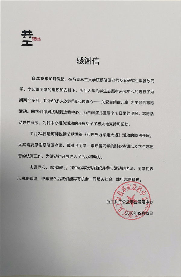 近日,浙江共工公益事业发展中心向马克思主义学院的蔡晓卫老师、戴雅欣同学、李茹蕾同学,以及所有参与志愿活动的同学们发来感谢信,感谢他们在这段时间的耐心协调与认真工作,感谢他们对“来自星星的孩子”的关怀与爱护。志愿同心,你我同行,在此也号召全体师生积极参与志愿活动,践行志愿精神,为校园文化繁荣发展做出更新、更大的贡献。