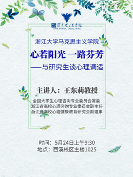 为培育新时代大学生自尊自信、理性平和、积极向上的社会心态,普及心理健康知识和文明理念,我们将于5月24日上午9点30,在西溪校区教学主楼1025室举办以“树立健康理念,放飞青春梦想”为主题的心理健康讲座。此次我们邀请浙江大学马克思主义学院王东莉教授担当讲座的主讲嘉宾。