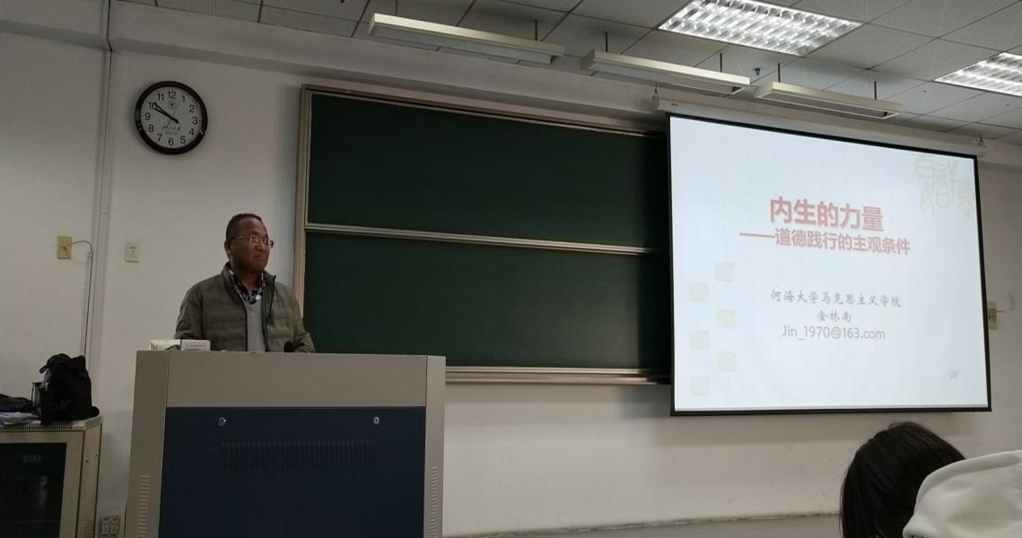 2019年11月20日上午,河海大学马克思主义学院金林南教授走进浙江大学“思修”课堂,给同学们带来了一场题为《内生的力量:道德践行的主观条件》的精彩讲学。浙江大学马克思主义学院封丽萍老师担任主持人,浙江大学200余名同学积极参与此次活动。