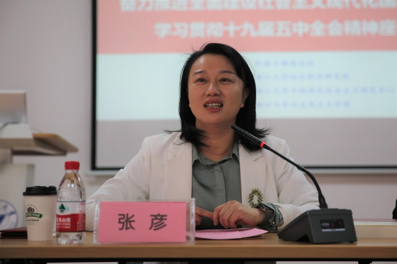 党委宣传部副部长章旻对党的十九届五中全会后学校的三大任务进行了传达,一是要迅速兴起学习贯彻的热潮;二是运用五中全会的精神指导学校“十四五”规划的制定;三是将五中全会的会议内容转化为研究指南,进一步提高全校的理论研究水平。
