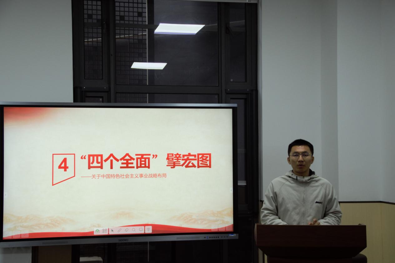 会议第二项是支部经典特色系列活动——月“习”经典党员讲党课活动。此次党课主题为《习近平在浙江》采访实录,由第六小组成员赵宸、于雪哲、张潇雨、马琪进行讲解。《习近平在浙江》是反映习近平总书记成长历程系列采访实录的第七部,是习近平主席于2002年10月至2007年3月任浙江省委副书记、代省长和省委书记的领导工作历程。四位同志围绕“八八战略”、“基层工作”、“外事工作“、”三农工作“四方面展开对习近平总书记成长历程的分析。其中,“八八战略”是习近平同志在总结浙江经济社会多年发展经验的基础上,全面系统阐释了浙江发展的八个优势,提出了指向未来的八项举措,为浙江转型发展和长远发展奠定了坚实基础,也成为习近平新时代中国特色社会主义思想形成的重要理念和实践准备。