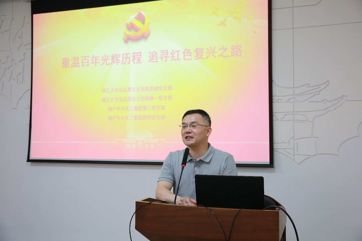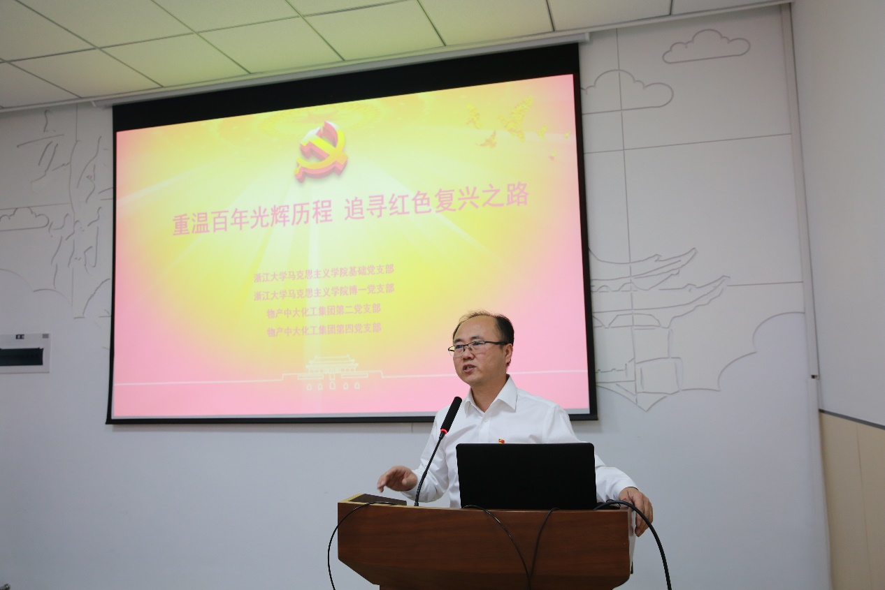 6月24日下午,浙江大学马克思主义学院“基础”教研中心党支部、博士生第一党支部与物产中大化工集团第二、第四党支部共同开展的主题党日活动在浙江大学紫金港校区顺利举行。浙江大学马克思主义学院党委书记李小东、副院长代玉启,物产中大化工集团副董事长、总经理、党委副书记陈海滨,物产中大化工集团董事、党委副书记、工会主席时贞仑及各支部党员共同参加活动。