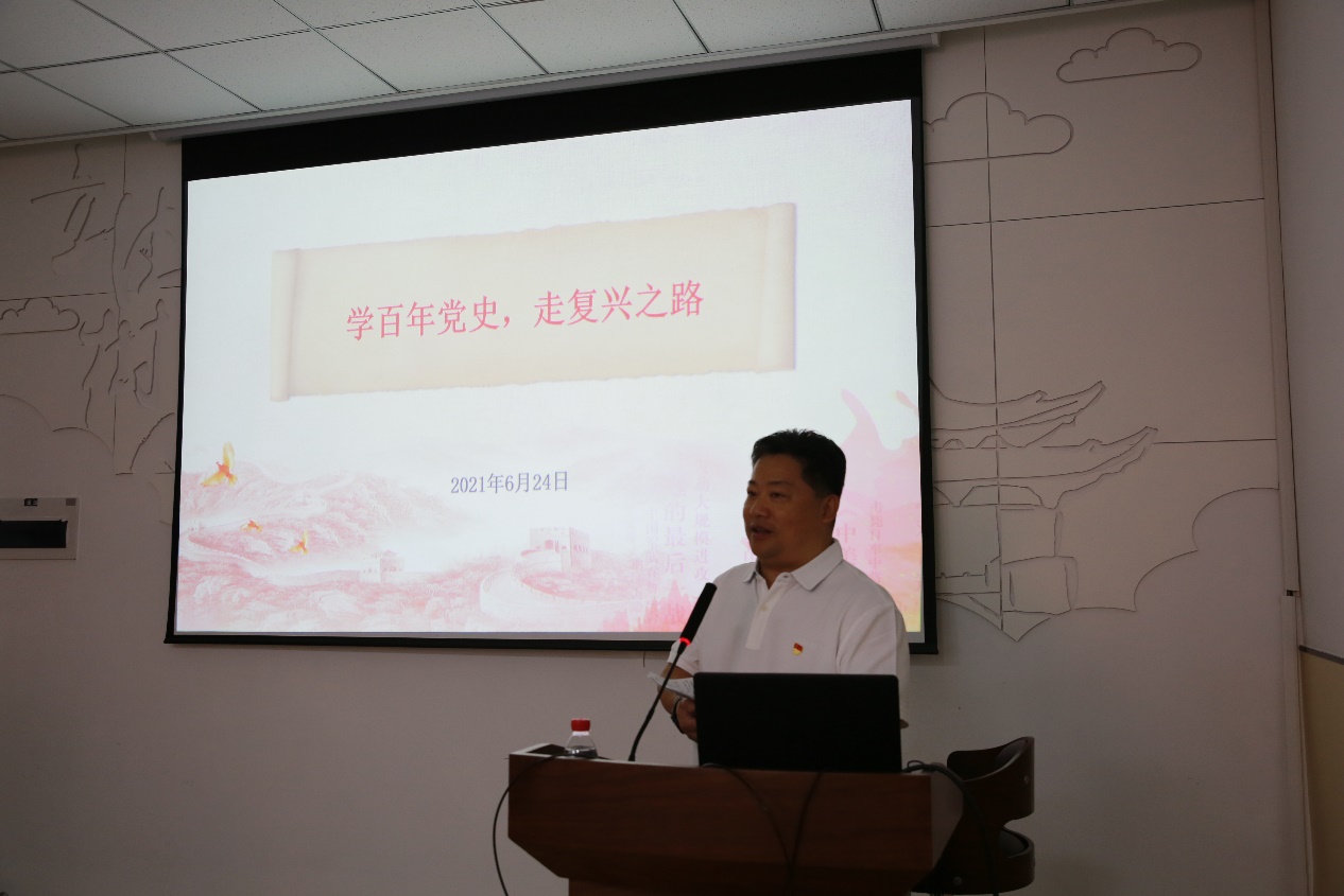 “基础”教研中心党支部钟为民老师,为全体党员讲授题为“学百年党史,走复兴之路”的党课。钟为民老师引用习近平总书记的话:“我们党已经发展成为一个走过百年光辉历程、在最大的社会主义国家执政70多年、拥有9100多万党员的世界上最大的马克思主义执政党,中国共产党立志于中华民族千秋伟业,百年恰是风华正茂。”钟老师的党课声情并茂,让大家深刻认识到红色政权来之不易、新中国来之不易、中国特色社会主义来之不易,并回答了中国共产党为什么能、马克思主义为什么行、中国特色社会主义为什么好等问题。随后,钟为民老师通过播放四个视频片段带领大家重温了中国共产党在新民主主义革命、社会主义建设、改革开放及现代化发展四个方面的百年历程,讲述了四个故事,分别是“一九二一:一个大党诞生于一条小船;开国大典:这犹如黑暗中的一道霞光;大江大河:没有一成不变的发展道路;复兴之路:而要一棒接着一棒跑下去”。