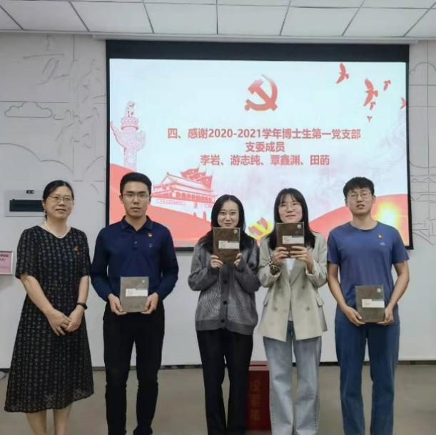 会议第三项,徐晓霞老师代表学院向2020-2021学年博士生第一党支部支委成员李岩、游志纯、覃鑫渊、田菂四位同志表示感谢并合影留念。