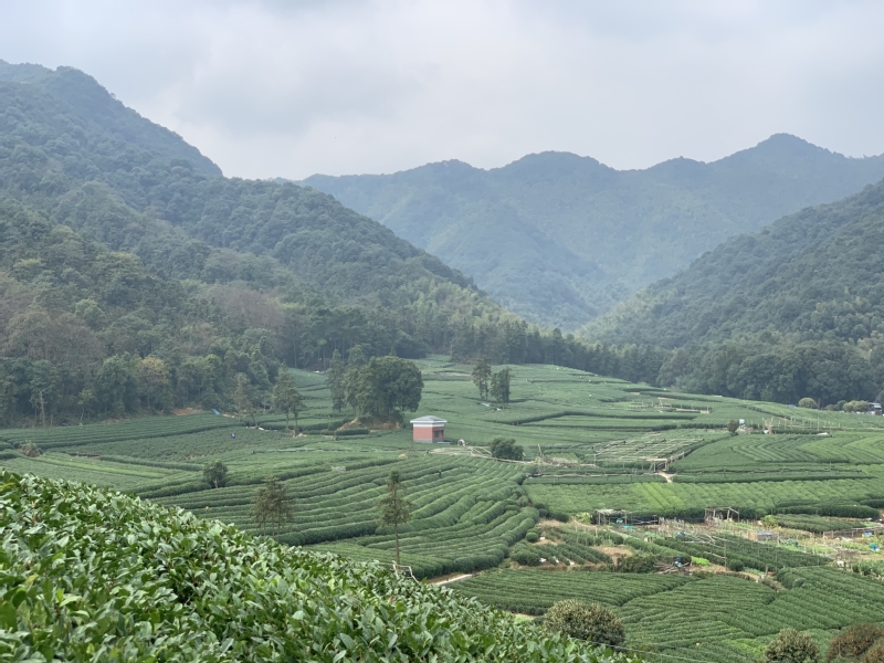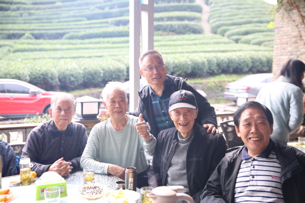 上午十时,老师们来到了风景如画的龙坞茶村。山腰上满眼是修剪整齐和带有韵律感的绵延茶山,一路徒步上茶山,满眼绿意,感觉清洗了下多日疲惫的眼睛,时不时还混和着道旁残存的桂花香味,给人带来一阵微凉。山岰间,分布着大块大块的茶园,偶而可见有戴着草帽的茶农在其间劳作。沐浴着金秋阳光,欣赏着秋日美景,老教师们纷纷驻足合影留念、畅聊往昔情谊。