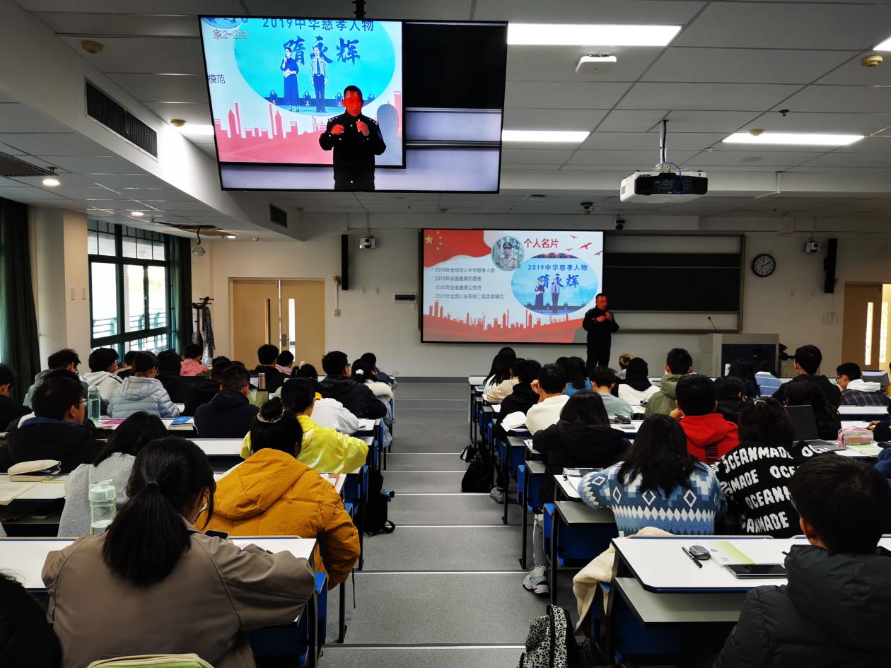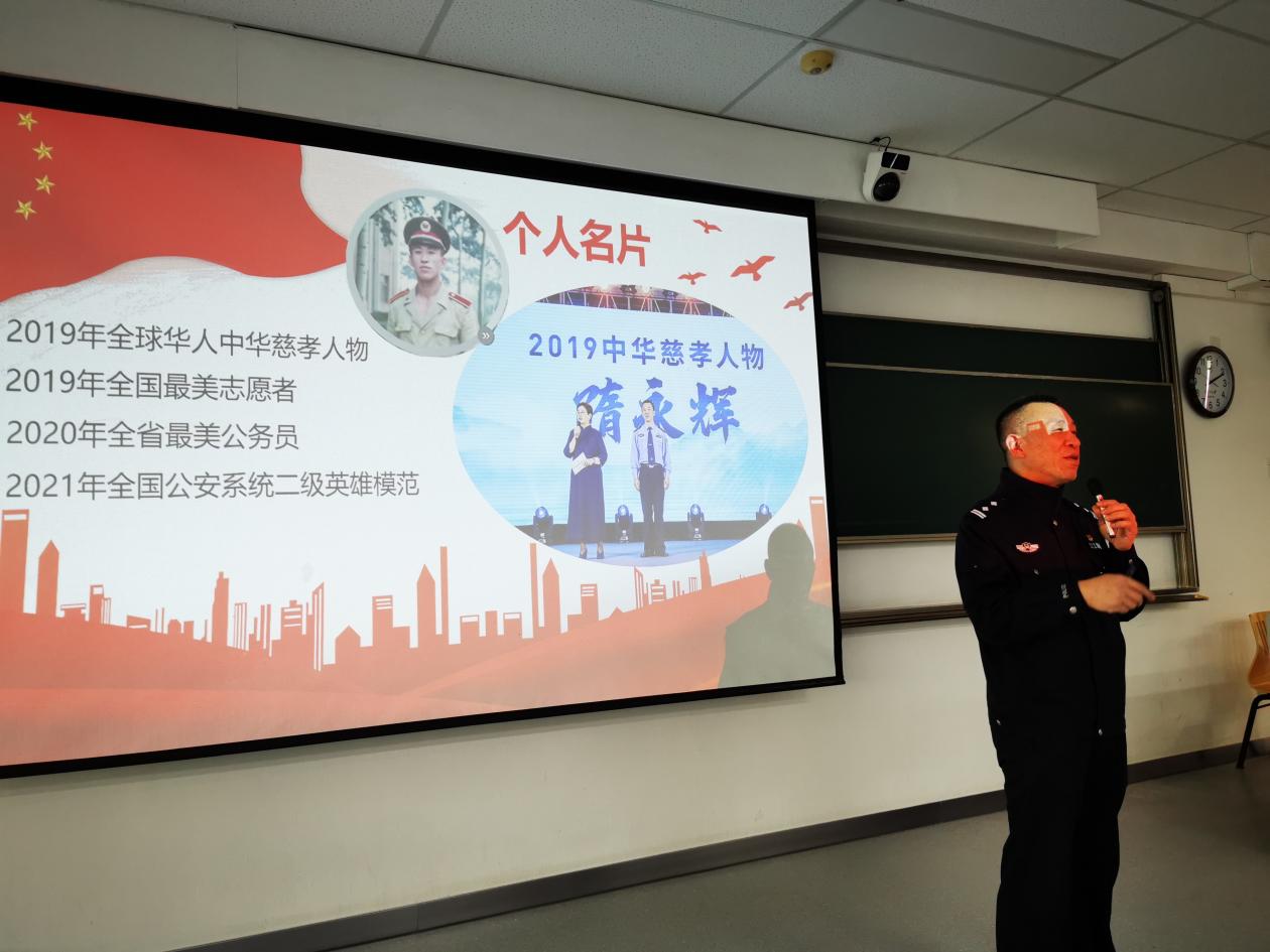 窗外严寒,但人心温暖。为了更好地让同学们理解社会主义核心价值观,以及向道德模范学习,11月8日下午,梁清华老师邀请杭州市公安局西湖区分局警务督察大队一级警长隋永辉警官来到了思想道德与法治的课堂,给同学们上了激情澎湃又温暖人心的一课。有着“寻人总司令”,“红衣刑警”之称的隋警官是全国唯一一位专门以寻人作为本职工作的警官。于2014年开始投身全国打拐寻人公益事业。截至今天,西湖区分局”永辉工作室”已经帮助7863个失散的家庭重新团圆,从警期间,被评为全球华人中华慈孝人物、浙江省最美公务员、最美浙警(浙江省公安厅授予)、第十五届杭州市道德模范、第七届最美杭州人、全国最美志愿者、全国公安系统二级英雄模范;先后荣立二等功一次、三等功一次。如此“重量级”人物的到来,得到了同学们的热烈欢迎。