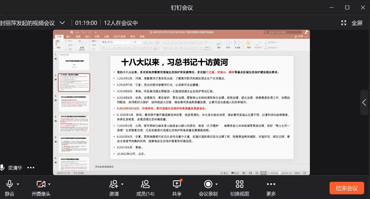 活动伊始,姚老师介绍了本次理论学习的主要内容以及主题党日活动的主要议程。之后,在梁清华老师的领学下,大家集体学习了习近平总书记在深入推动黄河流域生态保护和高质量发展座谈会上的重要讲话。梁老师首先介绍了党的十八大以来,习近平总书记十次实地考察黄河流域生态保护和发展的基本情况。继而以鲜明的问题导向和强烈的问题意识阐释了我们“为什么关注黄河流域生态保护和高质量发展”这一问题。黄河流域是我国重要的生态屏障,是我国重要的经济地带,是打赢脱贫攻坚战的重要区域,因此,保护黄河是事关中华民族伟大复兴的千秋大计。随后,梁老师重点分享了习近平总书记对黄河流域生态保护和高质量发展所作出的重要指示。习近平总书记指出沿黄河省区要坚持正确政绩观,准确把握保护和发展关系,要统筹发展和安全两件大事,提高风险防范和应对能力,要提高战略思维能力,把系统观念贯穿到生态保护和高质量发展全过程,落实好黄河流域生态保护和高质量发展战略部署,坚定不移走生态优先、绿色发展的现代化道路。习近平总书记特别强调“十四五”是推动黄河流域生态保护和高质量发展的关键时期,为此要加快构建抵御自然灾害防线,全方位贯彻“四水四定”原则,大力推动生态环境保护治理,加快构建国土空间保护利用新格局,在高质量发展上迈出坚实步伐。