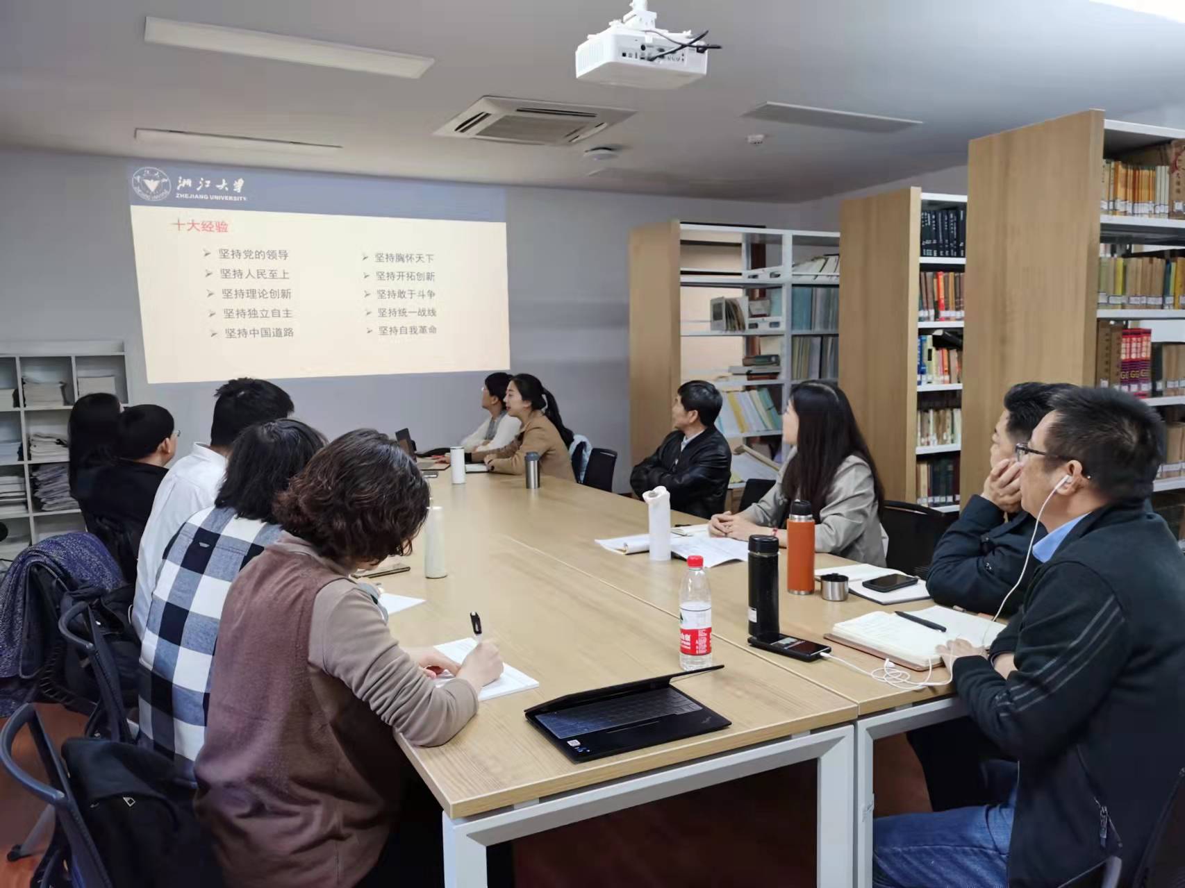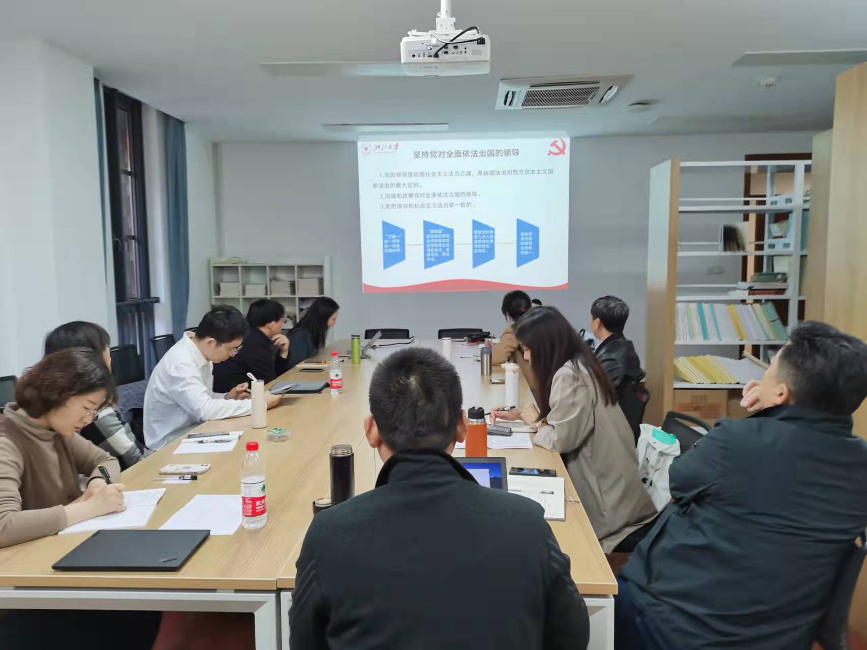 接着,蔡晓卫老师结合十三个伟大成就中的“全面依法治国”与支部成员讲党课并分享了她对“习近平法治思想如何融入思想道德与法治课“的思考。首先,蔡老师重点阐释了党的十八大以来,全面依法治国取得的历史性成就以及习近平法治思想的形成过程。并在此基础上深入阐释了习近平法治思想的核心要义和理论精髓集中体现为“十一个坚持”。接着,蔡老师对“坚持党对全面依法治国的领导”这一重点内容进行了理论阐释,强调党的领导和社会主义法治是一致的,党的领导是我国社会主义法治之魂,是我国法治同西方资本主义国家法治的最大区别,我们要加强和改善党对全面依法治国的领导。最后,蔡老师对党的领导和依法治国的内在实质关系以及党领导依法治国的具体体现进行了分享,并强调要认清“党大还是法大”的伪命题实质,对诸如此类的伪命题要保持高度警惕,并从理论上予以廓清与澄明。