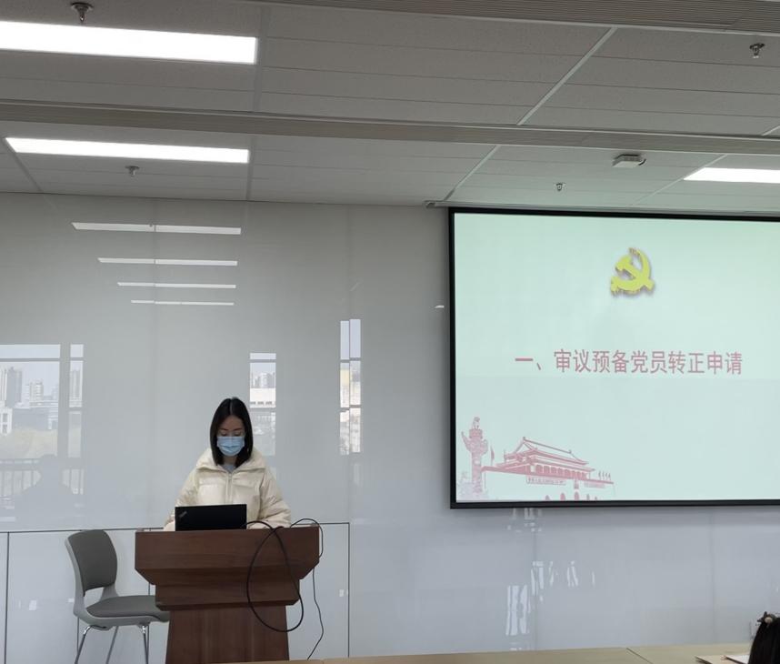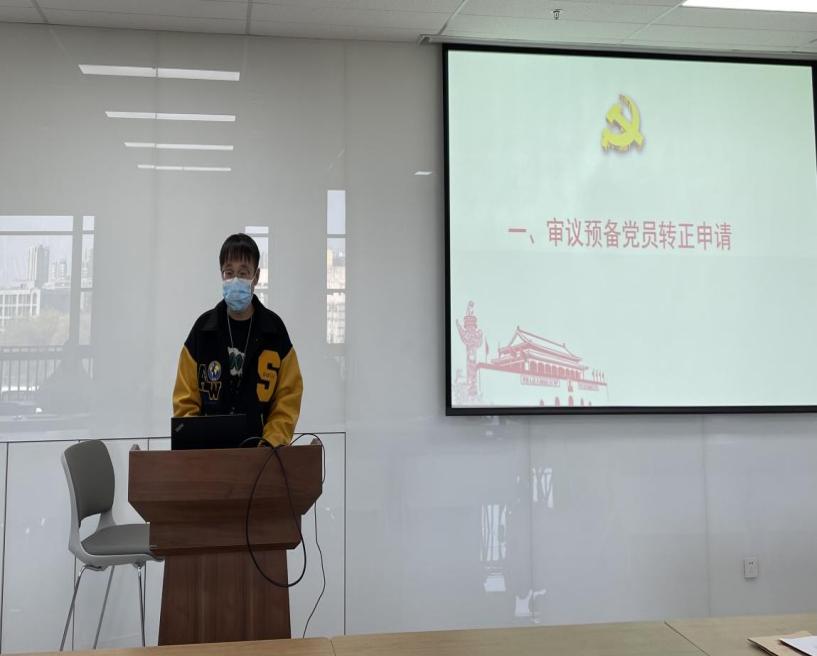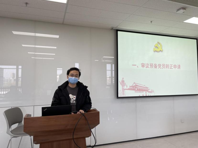 会议首先审议了预备党员张旭、王珊、丁中正、张乐、蔡亦恬转为正式党员的申请。五位预备党员首先向党组织汇报了自身在预备期的基本情况。回顾了自身一年来在思想上、学习上和在参与组织生活中取得的进步。五位预备党员均表示,在一年的预备期中,在思想上,深刻认识了中国共产党百年来的光辉历程,共产主义信仰愈发坚定;在行动上,树立了为社会主义现代化贡献青春力量,表明了以青春之我担起青春职之责的决心。接下来,五位预备党员的入党介绍人分别介绍了他们在考察期的基本情况,表明了同意按期转正的意见。韩晓阳同志也代表支委会向全体党员介绍了五位预备党员在预备期内的情况和考察意见,指出各位预备党员在预备期在学习、工作、生活上都起到了作为党员的先锋模范作用,表达了支委会一致同意他们按期转正的意见。经无记名投票,大会同意张旭、王珊、丁中正、张乐、蔡亦恬按期转正。五位预备党员分别表示这是人生中重要时刻,以此为新起点继续努力,无愧于中国共产党员的光荣身份。