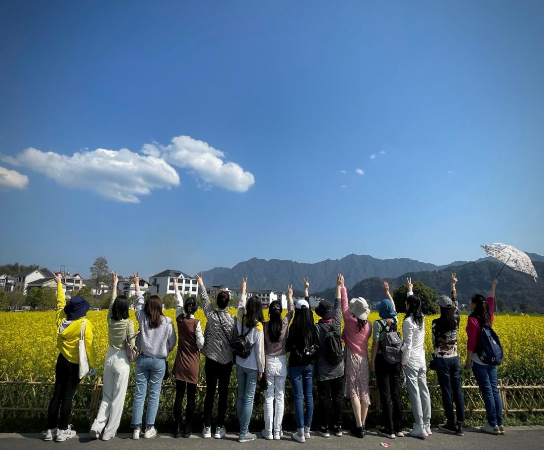 艳阳有情,和风有情,蓝天拥抱着白云,老师们行走在金色花海中,呼吸着新安江边的清新空气,感受着油菜花田的春暖花开。在画中行,老师们你拍拍我,我拍拍你,沉浸在美景中,偷得浮生半日闲,身心得到彻底放松。