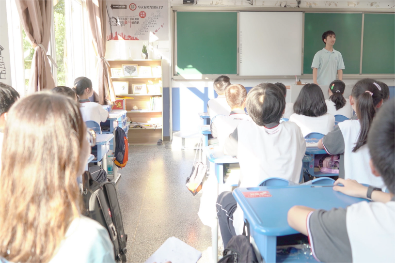 学院暑期社会实践团队成员张锐代表团队向建德市新世纪实验学校学生介绍浙江大学马克思主义学院以及本次社会实践的要旨,并向各位同学分享在浙江大学就读的深刻体会和逸闻趣事,充分展示了浙江大学研究生有自信、有志气、有骨气的精神状态。
