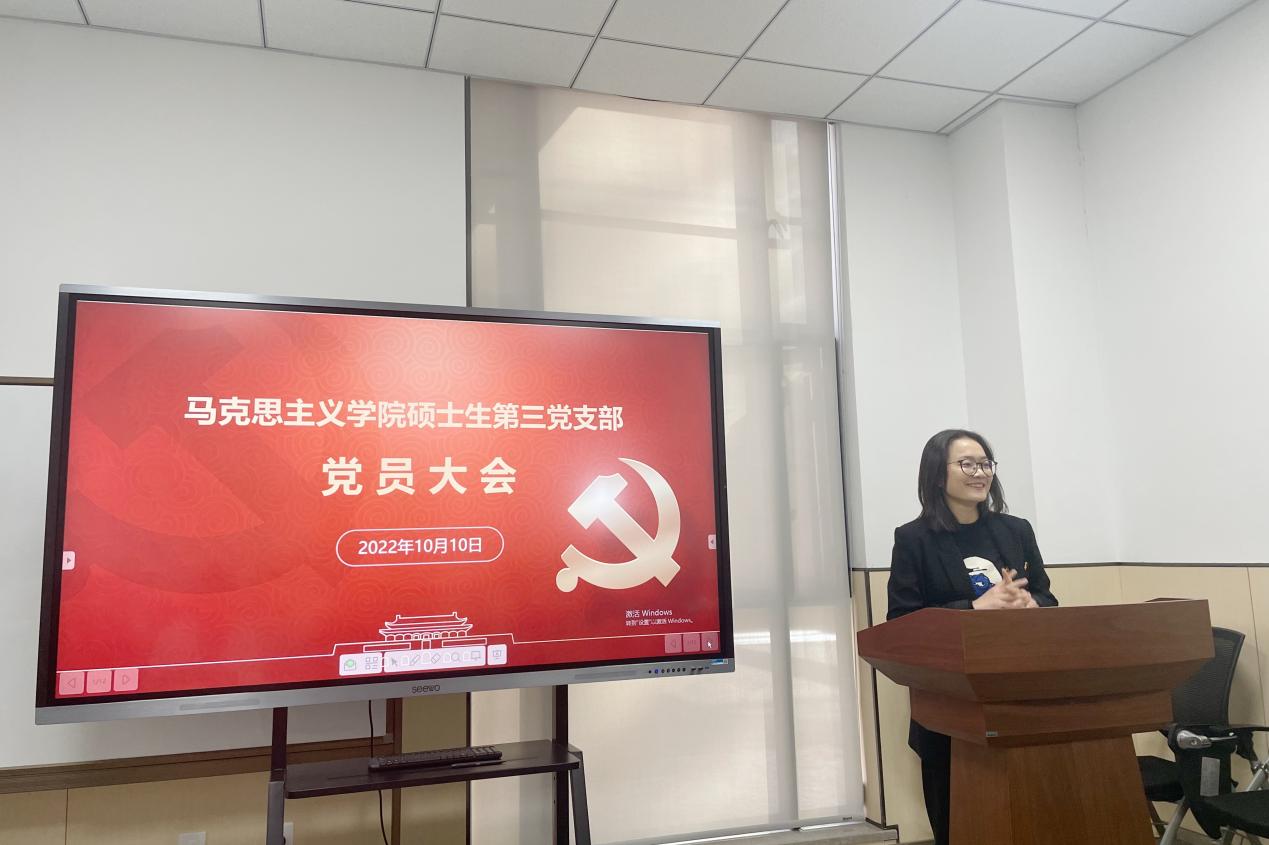 10月10日下午,马克思主义学院硕士生第三党支部在学院104教室召开党员大会。会议由李婷婷同志主持,学院党委副书记徐晓霞老师到会指导。
