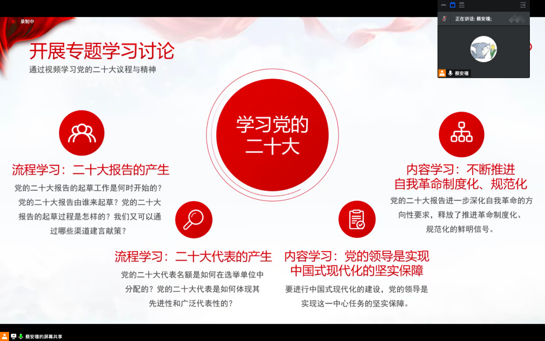 第三项议程是开展党的二十大精神专题学习讨论。支部同志们首先学习了北京高校思想政治理论课高精尖创新中心、中国人民大学马克思主义学院等联合推出的“喜迎二十大·看点面对面”系列微课第三讲《党的二十大报告是如何炼成的》与第四讲《党的二十大代表是如何选出来的》,从流程角度进行党的二十大精神专题学习。通过视频观看与学习,支部同志们进一步明确了党的二十大报告起草时间、起草人员与起草流程,党的二十大代表选举过程、名额分配及其先进性和广泛代表性。