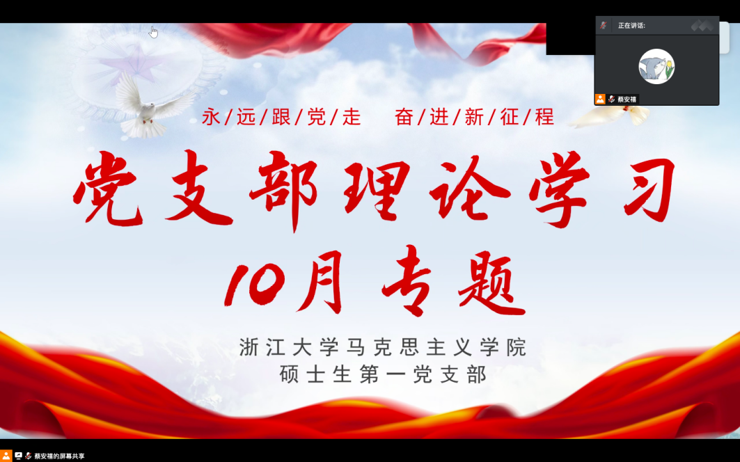 10月24日,马克思主义学院硕士生第一党支部举行“学习贯彻党的二十大精神”线上主题党日活动。会议由支部副书记蔡安禧同志主持。