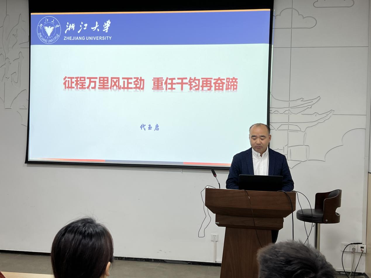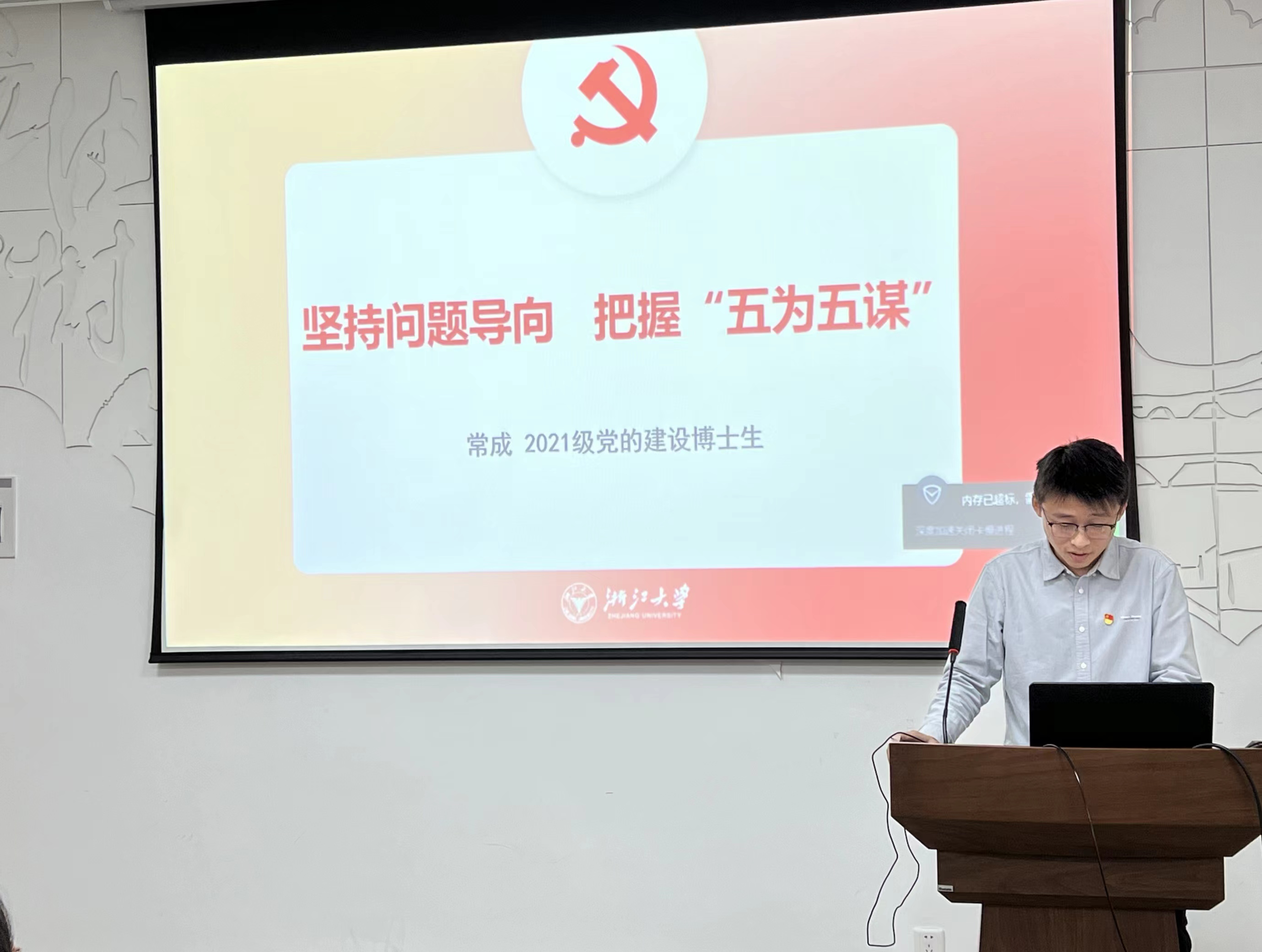 博士生第二党支部常成同志以“坚持问题导向,把握‘五为五谋’”为主题进行发言。常成同志指出,坚持问题导向要求我们博士研究生群体要带着“问题意识”做学问,头脑中既要有研究经典文本的“上篇”,更要有直面现实逻辑的“下篇”,为回答中国之问、世界之问、人民之问、时代之问贡献青年智慧与青年力量。