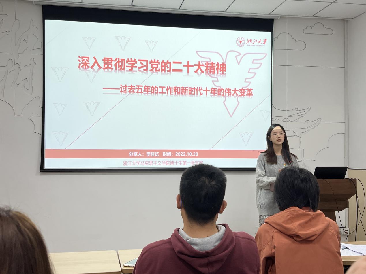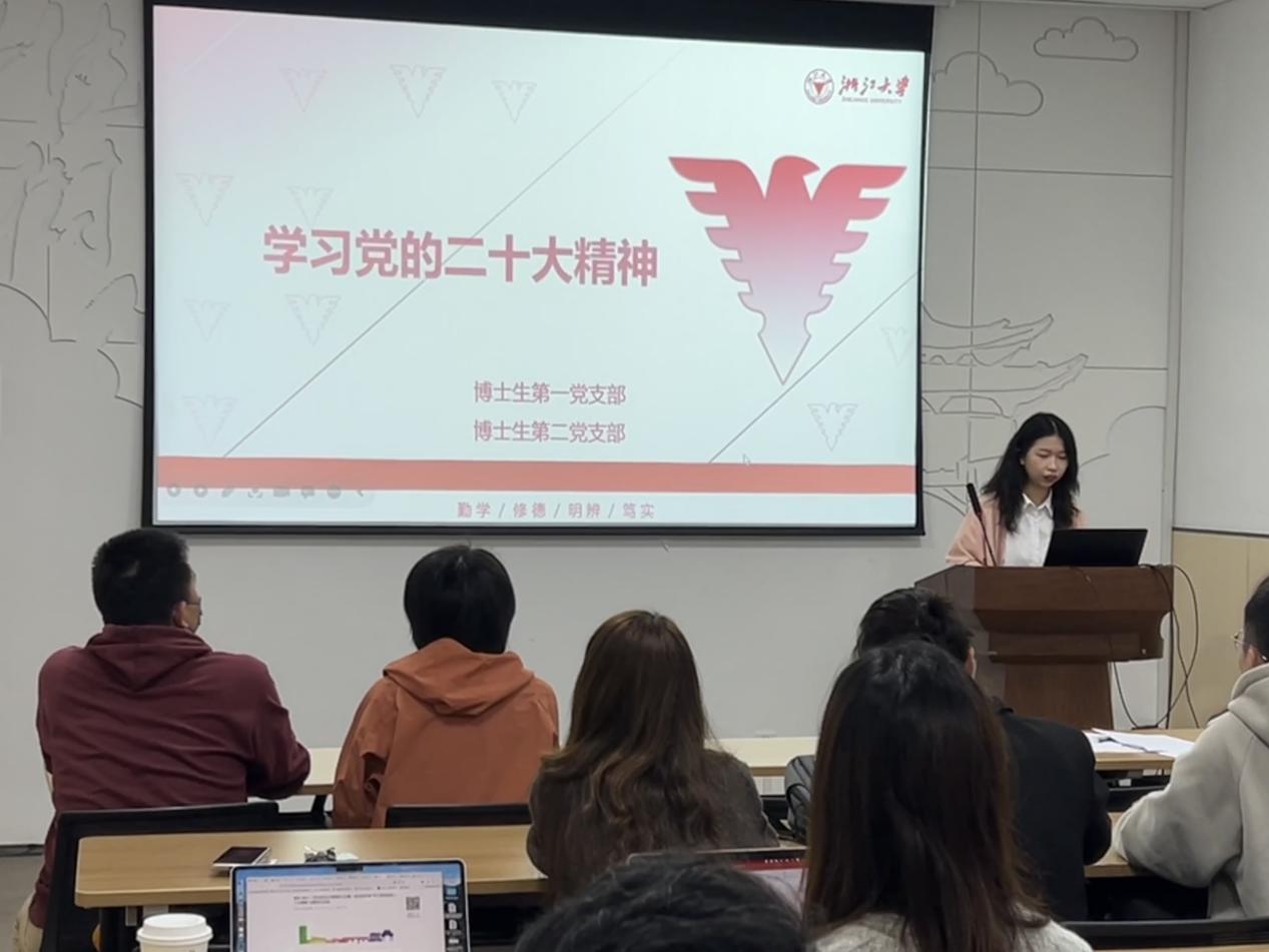 博士生第一党支部罗琳同志带领大家回顾党的二十大历程,生动展示了党的二十大的主要议程和准备工作,号召大家认真学习、领会党的二十大提出