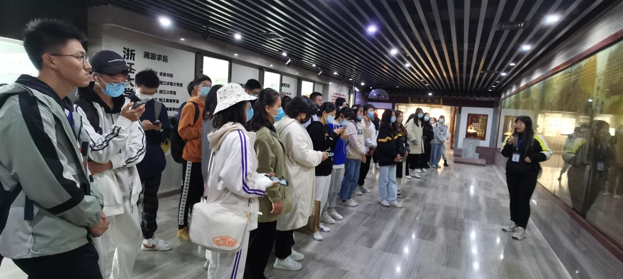 浙江大学校史馆主要由“求是溯源”“探求崛起”“调整发展”和“争创一流”四个部分组成。四个部分的内容不仅详实地描绘了浙江大学一百二十余年的发展历程,更将浙江大学不同时期的历史使命生动、具体地展现了出来。跟随讲解员的脚步,同学们对“求是创新”的校训有了更深刻的认识;在与讲解员的问答互动中,同学们也更为深刻地领悟到了使命、担当、责任、奋斗等的时代意涵。
