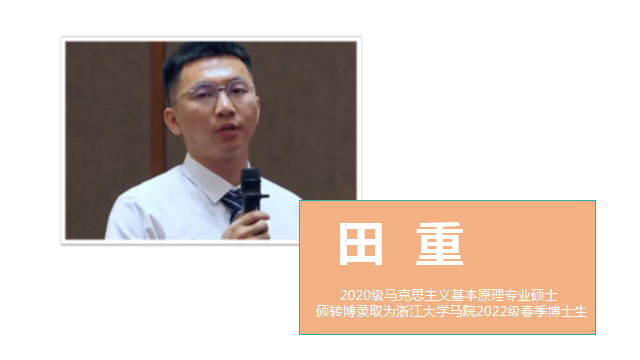 2020级马克思主义基本原理专业田重,分享了浙大马院硕转博的经验。首先,确立读博规划后一定要提前做准备,提升课业成绩,丰富科研成果。其次,考博笔试一定会有对经典文献的考察,所以要注意阅读经典原著,夯实基础,而专业面试则会根据科研材料、马克思主义理论热点进行提问,要注重对意向导师相关研究成果的把握。英语方面要注重平时积累,打好基础,面试要展示自己的学术能力及对研究领域的独到见解。最后田重学长提到,良好的心态以及健康的身体是决胜的关键,要放松心态,将硕转博的压力变成前进的动力。