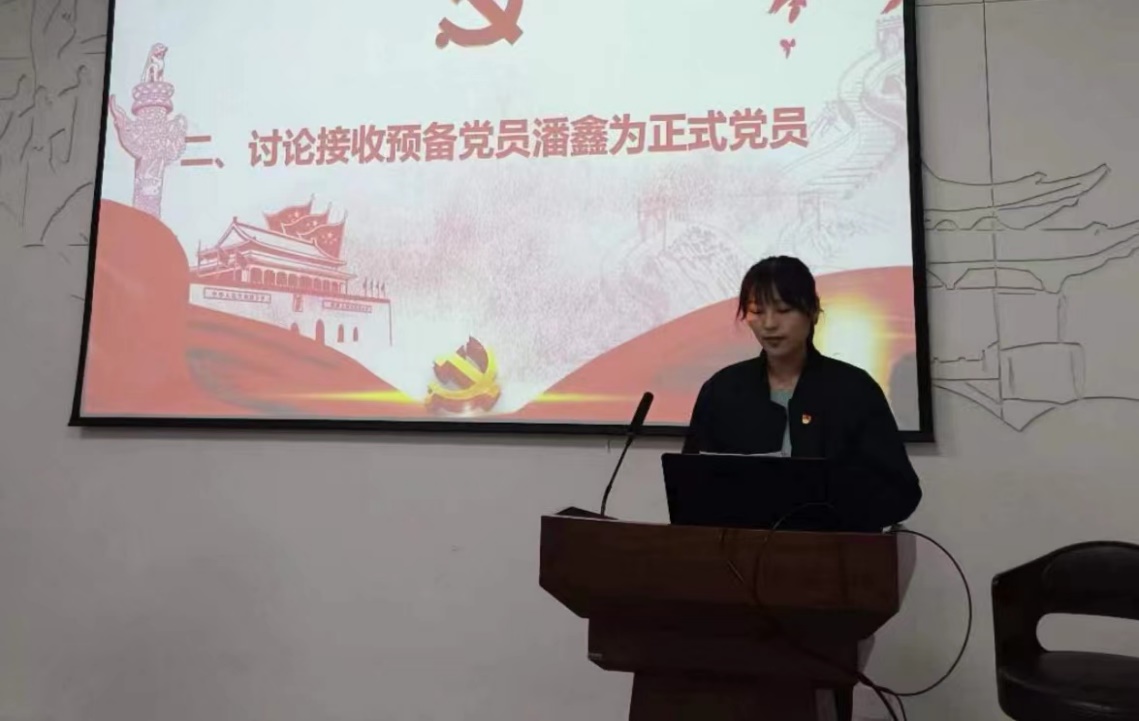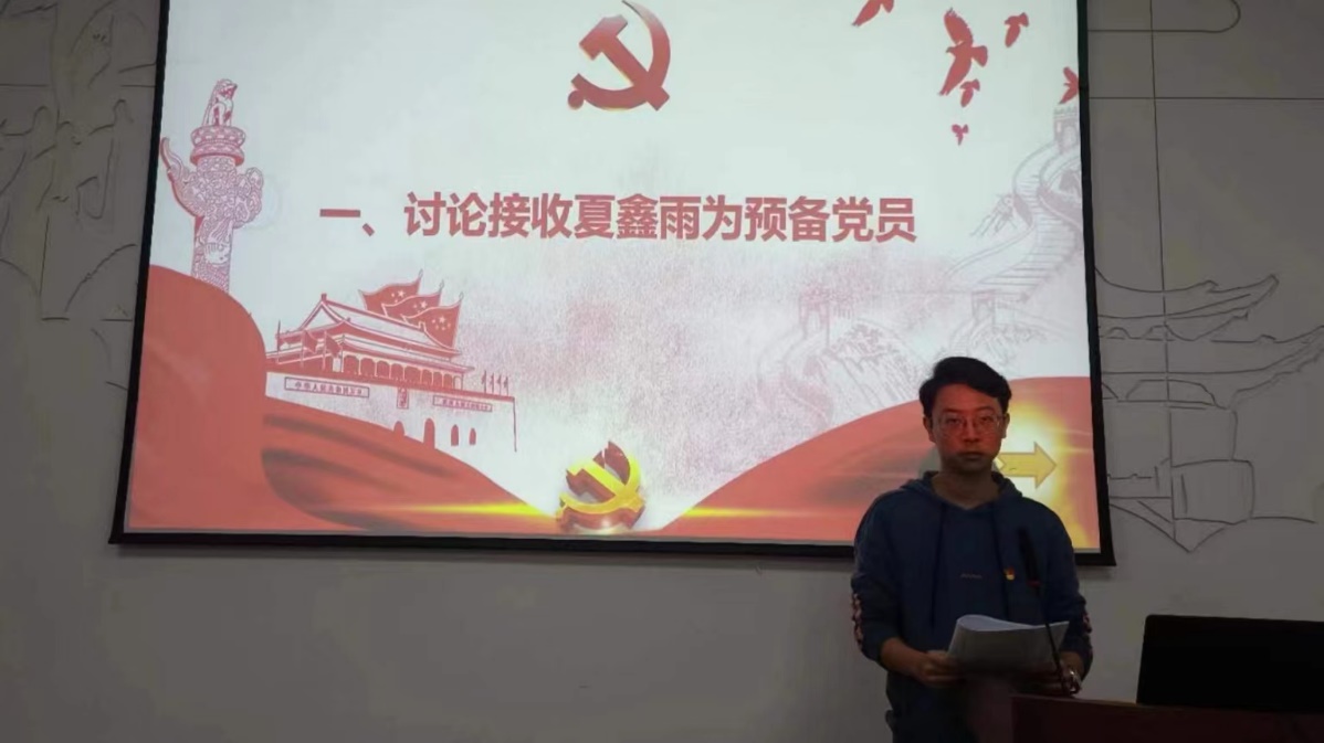 会议首先审议了接收夏鑫雨同志为预备党员。夏鑫雨同志向大会宣读了入党志愿,他报告了自己在思想上、学习上、实践上强化理想信念的努力,表达了申请加入党组织的强烈意愿。两位入党介绍人张诚同志和刘泽同志介绍了夏鑫雨同志的基本情况,常成同志代表支部委员会报告了对夏鑫雨同志的审查情况。经无记名投票,大会同意接收夏鑫雨同志为预备党员。
