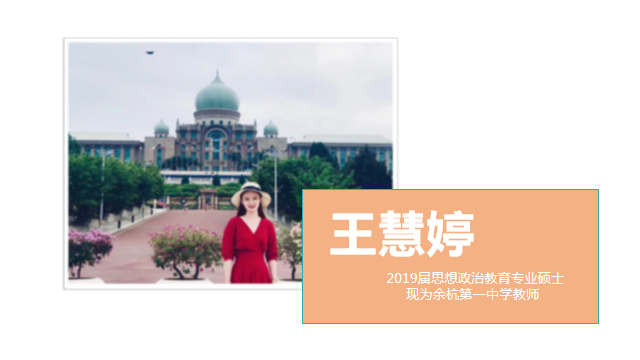 2019届思想政治教育专业硕士王慧婷,通过引用浙大校歌歌词展开分享。她以“大不自多 海纳江河”为引介绍自己,通过“靡革匪因 靡故匪新”重点讲解了如何进行准备工作。她认为,不同类型、地区的考试略有不同,因而信息和时间需要格外关注,且面试是招考的重中之重,备考者要注重服装、仪态、语言表达和知识讲授等方面内容。她鼓励学弟学妹们突出自己的长处,展现自信的一面,同时具备扎实的理论功底和教学水平。随后,她用“树我邦国 天下来同”介绍了新入职教师必须具备的几点素养以及如何在工作中提升自我,并特别强调了情绪价值的重要性。