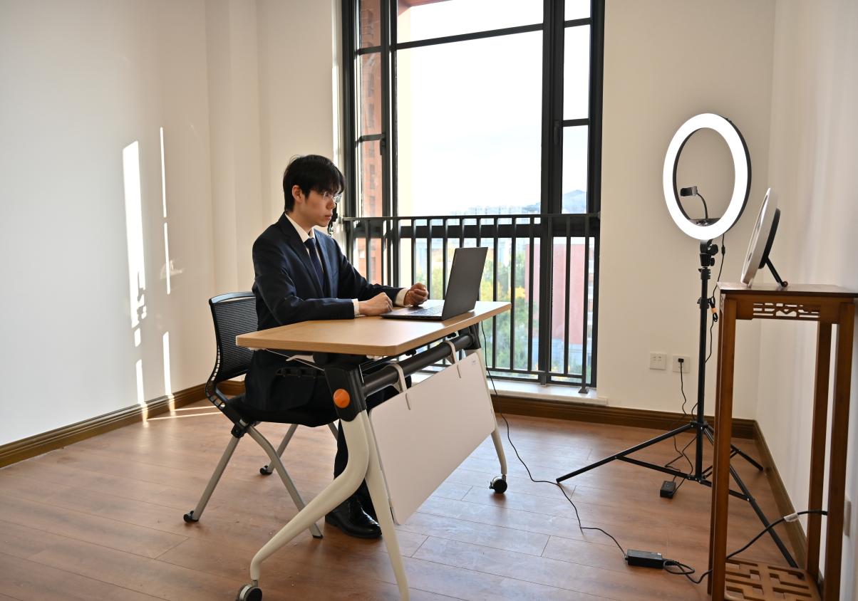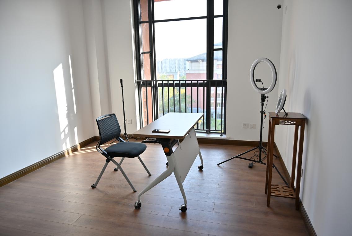“面试间”窗明几净、设备齐全。前后可调节支架打造多机位环境,前置钟表帮助把握时间,专业补光灯照亮你的美,多孔位插座保障长时段蓄能。“面试间”的一隅放置了一面立式全身镜,正式面试前,毕业生可以在这里调整衣冠、端正仪态、放松心绪、缓解压力。小空间、多巧思、大效用。一应俱全的“云面试间”致力于全方位无死角地保驾面试、护航就业,为毕业生疏通线上面试的“最后一公里”。