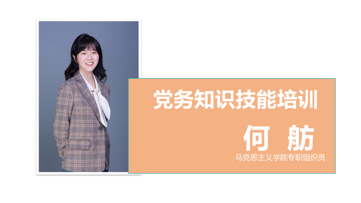 马克思主义学院专职组织员何舫老师党务知识技能培训,何老师从组织员工作的背景与意义、调研与案例、要求与规范、思考与体会四个方面做了党务知识技能培训,启发大家做好组织员工作。一是要解放思想,与时俱进。自觉发挥政治经验优势,不断创新呈现形式,通过各种平台载体做好宣传教育,普及党史知识;二是要勤加思考,定期复盘。做好组织工作要在精准、精细方面做扎实、做到位。要严于细,方寸显本领。定期复盘,才能把细节做好,不断进步;三是要坚持原则,按章办事。组织工作政治性、原则性、纪律性强,容不得半点马虎大意;四是要换位思考,以人为本。“常怀为民之心,常兴为民之举”,将心比心、以心换心、以心交心,要以一种看得见、摸得着、体会得到的“温度”实实在在、真心实意地做好组织员工作。