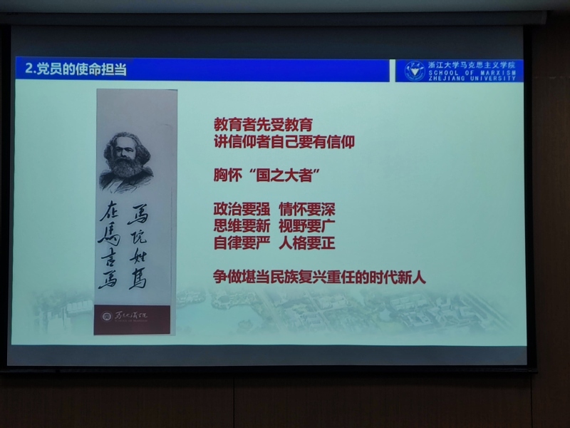 第二,什么是党员的使命担当。为中国人民谋幸福,为中华民族谋复兴,是中国共产党的初心和使命,每一位党员必须铭记在心,实践在身。浙江大学马克思主义学院的研究生党员,应当将自身的发展与学院的发展、学校的发展融合在一起,与国家的发展融合在一起,争做堪当民族复兴重任的时代新人。
