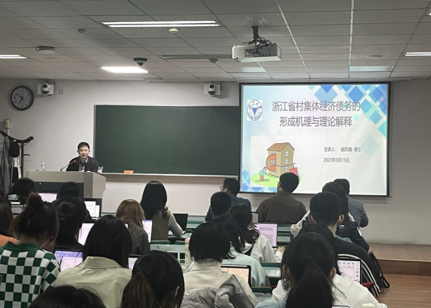 为让同学们更好地理解中国特色乡村治理,认识当前乡村振兴过程中面临的挑战和机遇,2023年3月15日,供职于杭州市委办公厅的胡天禛博士走进“习近平新时代中国特色社会主义思想概论”课堂,为同学们讲授“浙江省村集体经济债务的形成机理及其理论解释”专题课程。