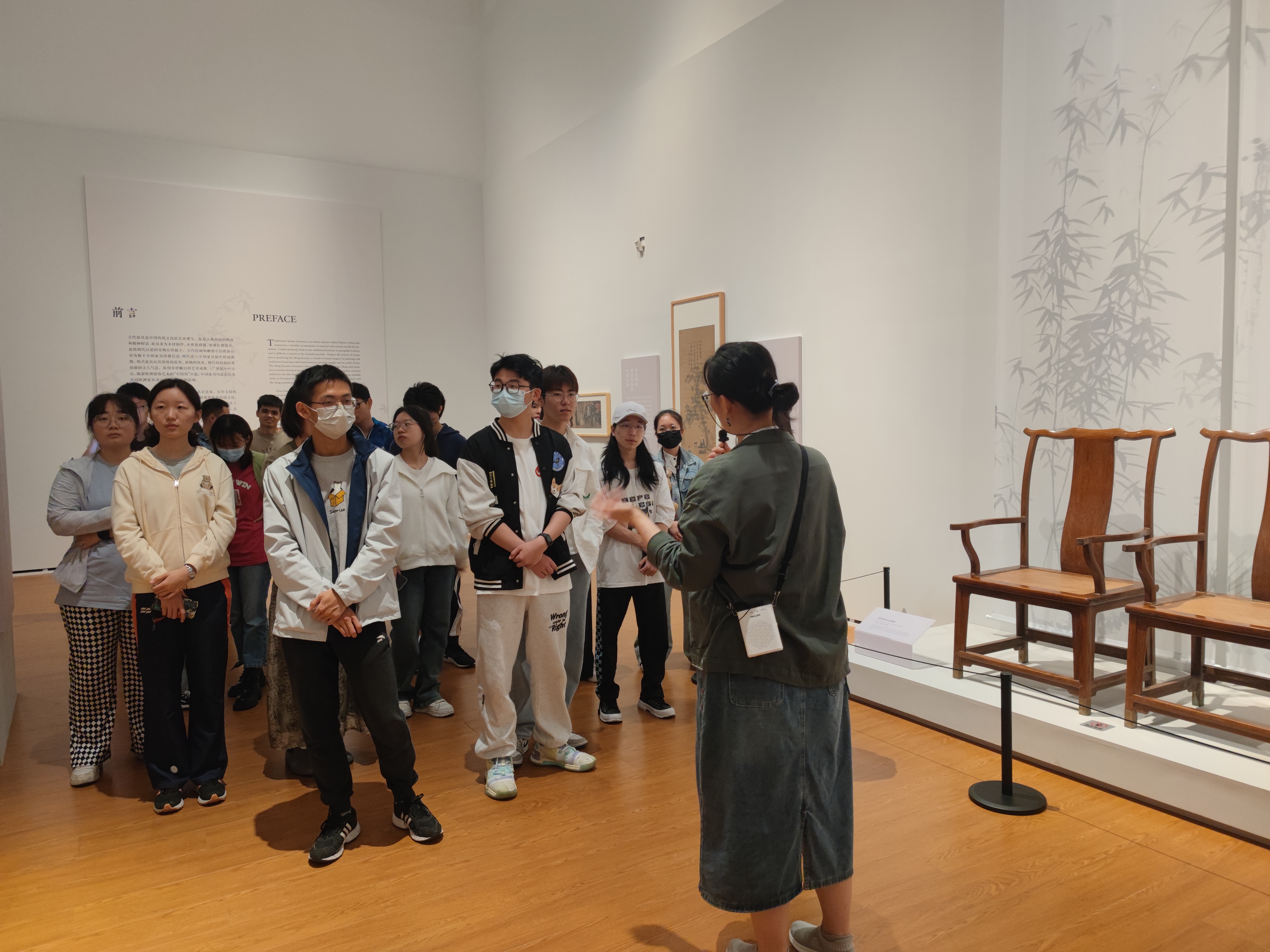 在周孝先、胡秀莲捐赠伉俪捐赠家具展馆,讲解员结合历史与展品,为同学们讲述了中国家具的发展演变过程。从制作材料、制作工艺到摆放方式,中国传统家具都有背后的文化与讲究。中式家具不只展现了繁复精巧的工艺,还有深厚悠久的历史,同学们在审美的过程中也感受了历史,窥见了中国历史长河中人民生活的一个角落。
