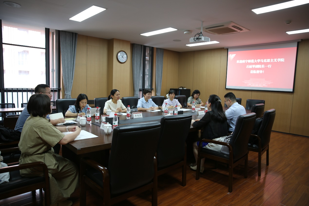 6月14日下午,南宁师范大学马克思主义学院石丽琴副院长一行到访我院参观交流。双方就学科建设、队伍建设、思政课教学改革等方面进行深入交流。学院马克思主义中国化研究所副所长傅夏仙老师、青年教师赵永帅老师参加座谈。