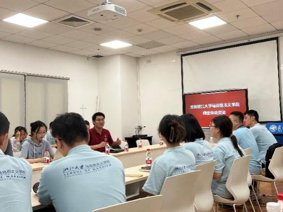 下午,实践团成员与复旦大学马克思主义学院的师生进行了交流座谈。复旦大学马院党委副书记赵琪老师向大家介绍了马克思主义理论本科专业的课程设置和学生工作情况,20级和22级马克思主义理论本科专业的三位学生代表孙瑜峤、陈睿康和杜昊语分享了专业学习的收获、班级建设和活动情况;浙江大学马克思主义学院首批马克思主义理论专业22级本科生谢赫然和邢珺瑶同学也分享了在浙大马院的学习情况,同学们从学业规划、课程学习、实践活动等方面进行了热烈的讨论和交流。