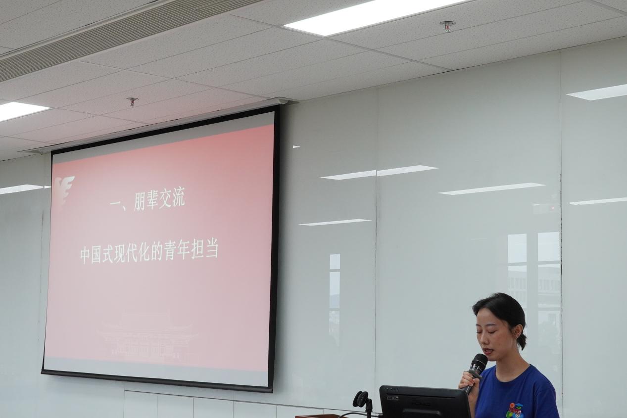 实践团成员首先来到浙江大学紫金港校区成均苑3幢521报告厅。主持人马克思主义学院博士研究生崔晨茜简要介绍浙江大学及浙大马院的相关情况之后,来自浙江大学和社会实践团的六名代表发言,就“中国式现代化的青年担当”这一主题进行交流: