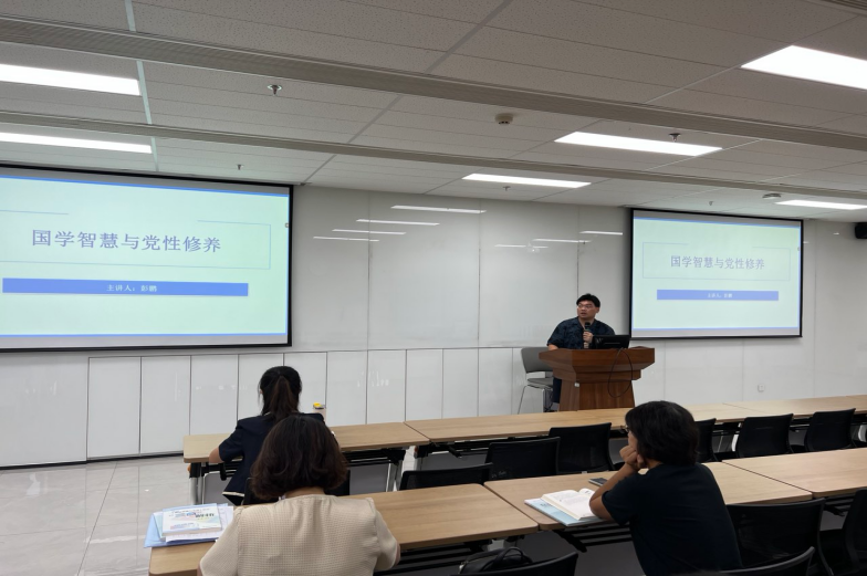 本次会议主要包括两个环节。一是深入学习习近平新时代中国特色社会主义思想。彭鹏老师作了题为《国学智慧与党性修养》的主题报告。他结合自身学术专长,从中华优秀传统文化角度阐释党性修养,围绕仁爱、见利思义、笃信好学、明德、敬德等核心理念系统梳理了优秀传统文化与党性修养结合的维度、内涵与路径。
